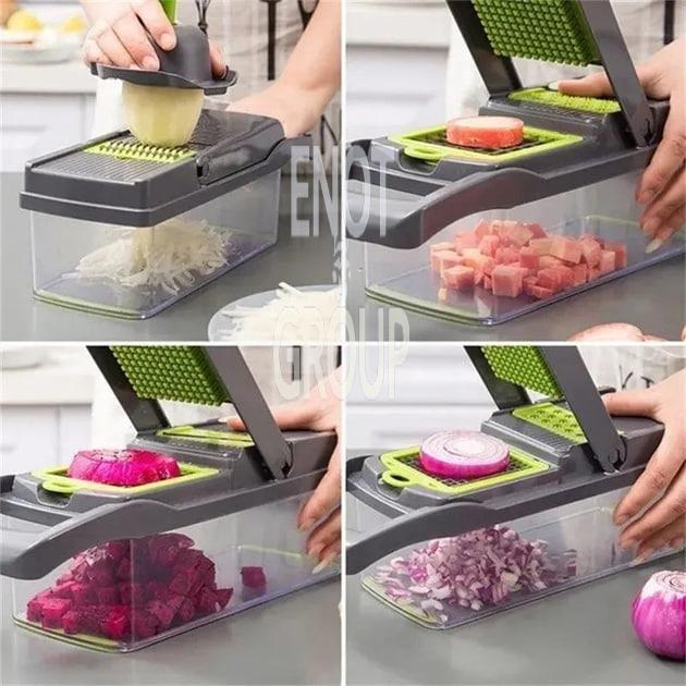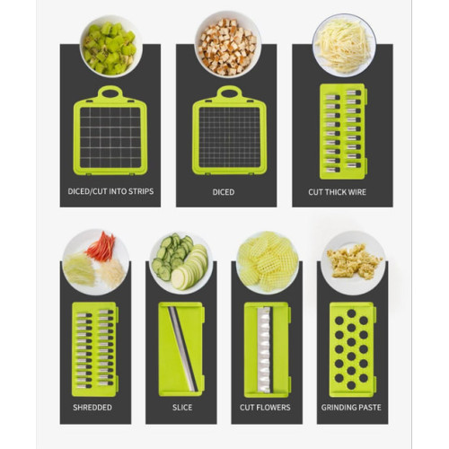 - Багатофункціональність: Овочерізка має кілька насадок для різних типів нарізки: скибочки, соломка, кубики тощо. Це дозволяє використовувати її для нарізки будь-яких овочів, фруктів і навіть сиру.