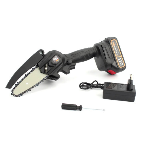 Міні пила оснащена шиною довжиною 10 см, ідеальною для різних завдань. Потужний літій-іонний акумулятор на 24В забезпечує довгу роботу та швидке заряджання, дозволяючи вам працювати без перерв.