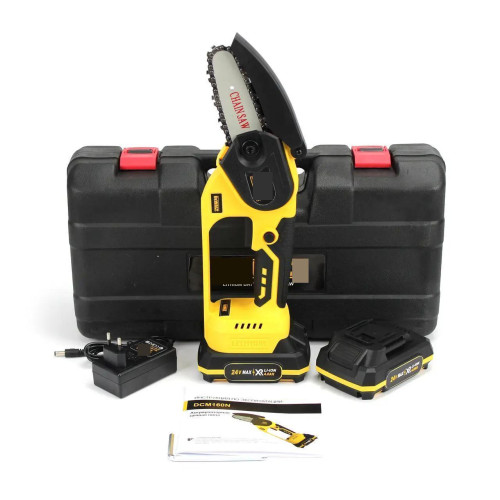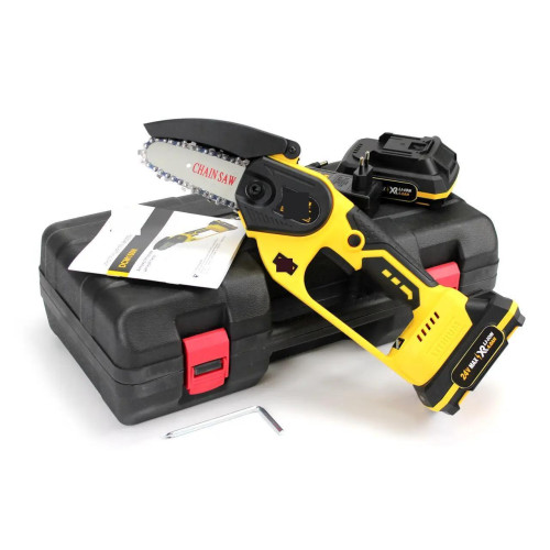 Міні-пила Instrumentop DCM160N з акумуляторною батареєю 24V та ємністю 4 Ач — ідеальний вибір для різання гілок, деревини та інших матеріалів. Її компактний дизайн і легка вага дозволяють працювати в обмежених просторах, знижуючи навантаження на користувача завдяки ергономічній конструкції.
