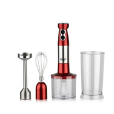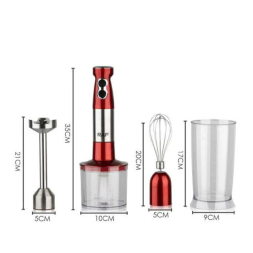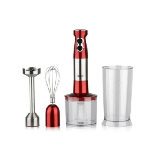 RAF R296 (4 в 1) – багатофункціональний пристрій, який поєднує можливості декількох кухонних приладів. У комплекті ви знайдете насадки для збивання, стаціонарну чашу для блендера, подрібнювач і міксер. Цей блендер ідеально підходить для приготування смузі, крем-супів, пюре, соусів, а також для подрібнення зелені чи горіхів.