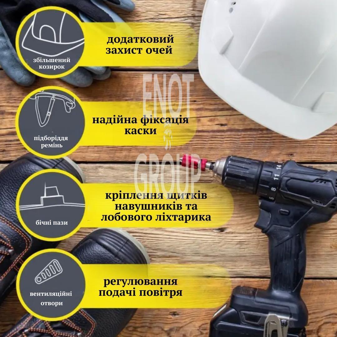 - Легка вага та зручність: Завдяки легкій конструкції каска не створює зайвого тиску на голову і дозволяє комфортно працювати тривалий час.