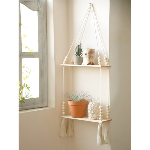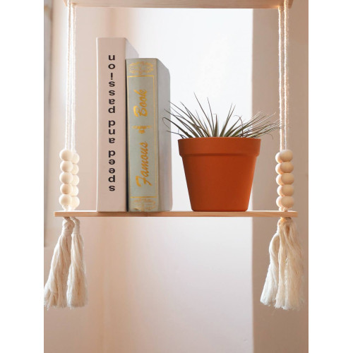 Два рівні полиці дозволяють організувати простір для кімнатних рослин, декоративних аксесуарів, сувенірів та фоторамок, створюючи затишну та гармонійну атмосферу. Ручне плетіння макраме надає виробу особливого шарму і робить його оригінальним акцентом у будь-якому сучасному інтер’єрі – від стилю бохо та мінімалізм до сканді чи лофт.