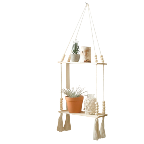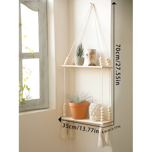 Створіть унікальний інтер’єр з підвісною декоративною полицею макраме на два яруси – ідеальним поєднанням практичності та стильного дизайну. Виготовлена з натурального дерева та бавовняної мотузки, полиця відрізняється міцністю та естетичною привабливістю.
