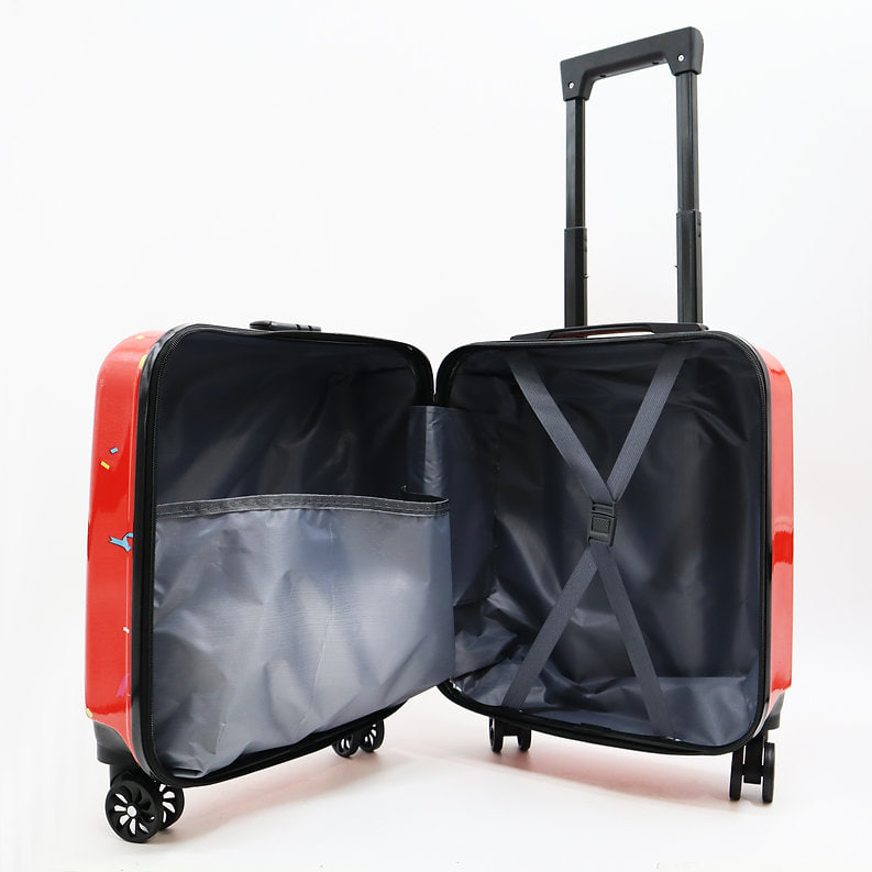 Внутрішній простір чемодана розділений на секції та оснащений фіксуючими ременями, які утримують одяг, іграшки та інші речі в порядку під час поїздки.
