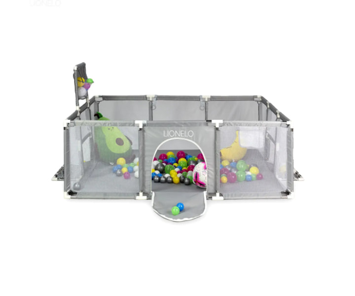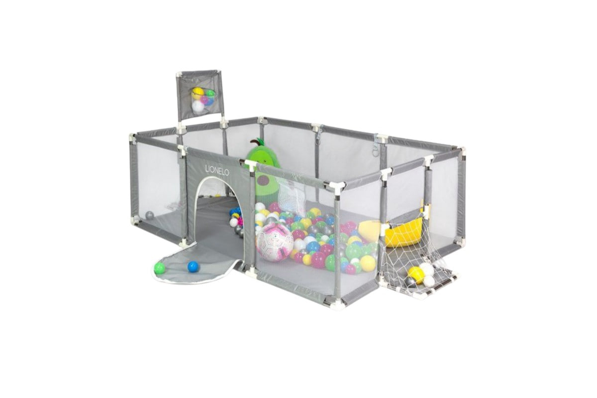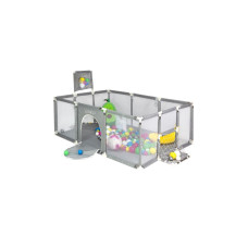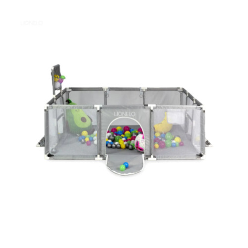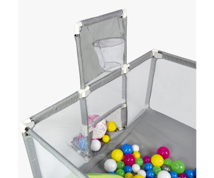Манеж оснащений сухим басейном із м’якими кульками, баскетбольним кільцем та міні-воротами, що робить гру різноманітною і захоплюючою. Конструкція виконана з м’яких безпечних матеріалів, які забезпечують комфорт і безпеку під час ігор. Сірий колір додає сучасного вигляду і гармонійно вписується у будь-який інтер’єр.