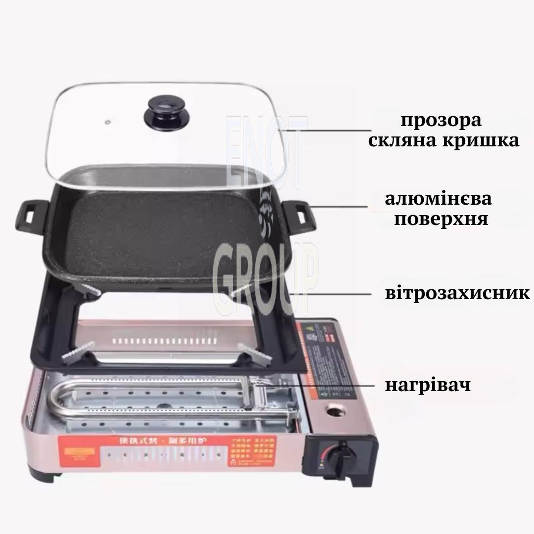 - Система безпеки – захист від перегріву та витоку газу, що забезпечує безпечне використання гриля у польових умовах.