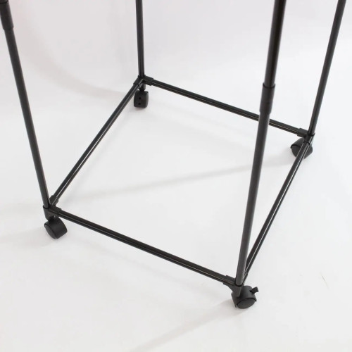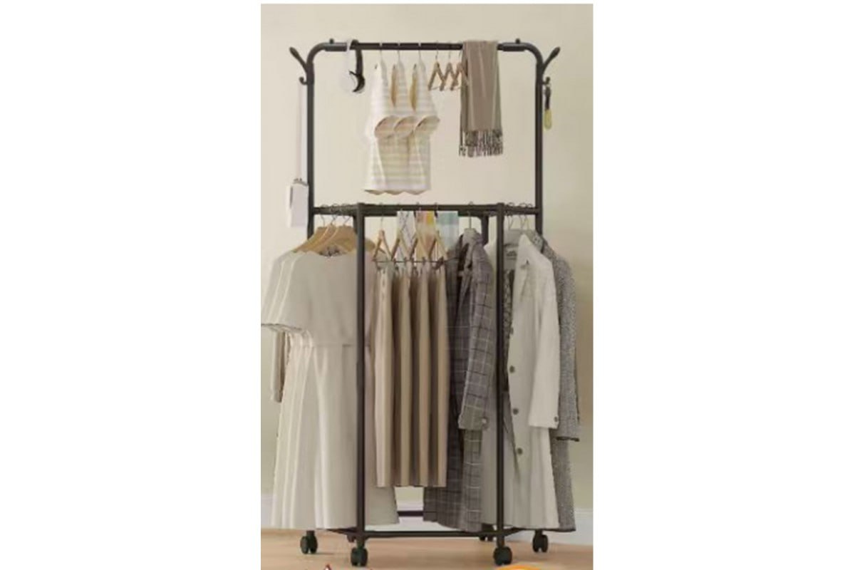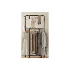 Посилений металевий каркас забезпечує стабільність конструкції та впевнене використання щодня. Чотири поворотні колеса дозволяють легко переміщати стійку по приміщенню, а фіксатори гарантують надійне розташування на одному місці. Це робить стійку ідеальною для динамічного простору — від квартири до торгового залу.