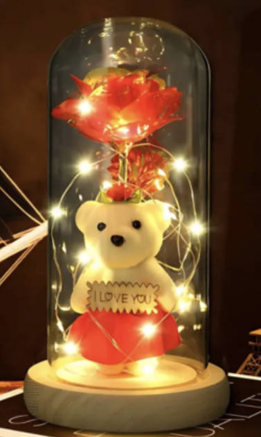 Шукаєте ідеальний подарунок для коханої людини? Троянда в колбі з LED-підсвіткою та плюшевий ведмедик з написом "I LOVE YOU" створені, щоб висловити ваші почуття. Цей набір поєднує стиль, романтику та тепло в одному подарунку.