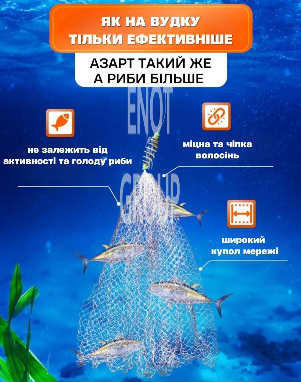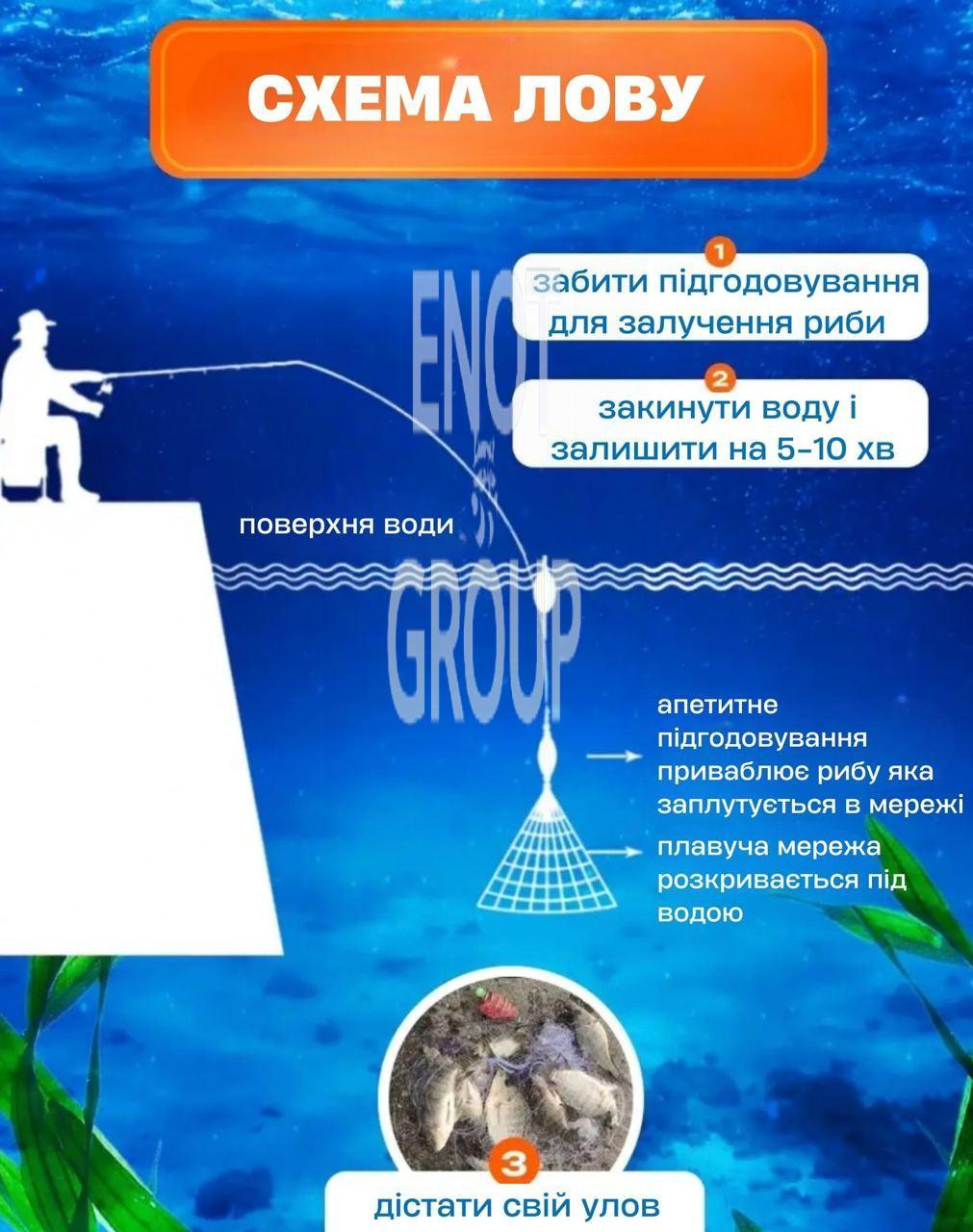 Ця сітка дозволяє легко й ефективно залучати рибу в зону лову, забезпечуючи гарний улов навіть у складних умовах.