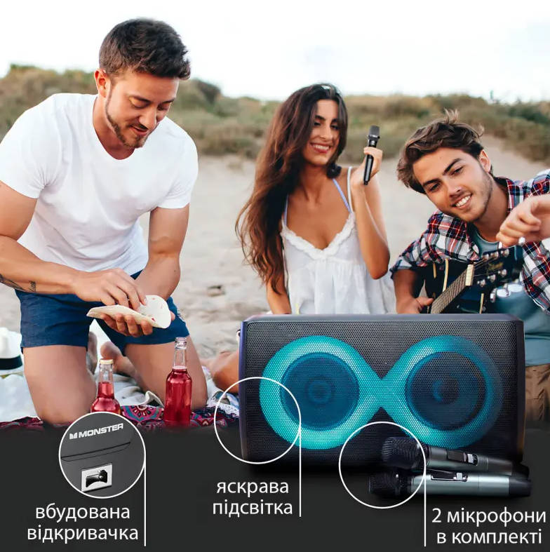 MONSTER CYCLE MS22138 забезпечує гучне та якісне звучання для музики та караоке. Два мікрофони у комплекті роблять колонку ідеальною для вечірок, виступів та спільних заходів. Компактний і надійний корпус дозволяє легко переносити пристрій і використовувати його будь-де.