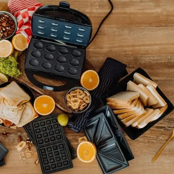 Прилад виконує 6 функцій в одному корпусі: вафельниця, сендвічниця, гриль, мультипекар, міні-сковорідка та підігрівач. Знімні панелі з антипригарним покриттям дозволяють легко змінювати режим роботи та швидко чистити пристрій після використання.