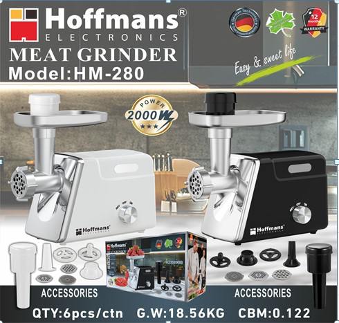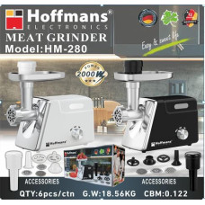 М’ясорубка Hoffmans HM-280 потужністю 2000W – надійний і високоефективний пристрій для приготування домашнього фаршу, котлет, ковбас та подрібнення м’яса, риби і овочів. Потужний електродвигун забезпечує швидке та рівномірне перемелювання навіть щільного або замороженого м’яса, дозволяючи економити час і отримувати однорідний, соковитий фарш.