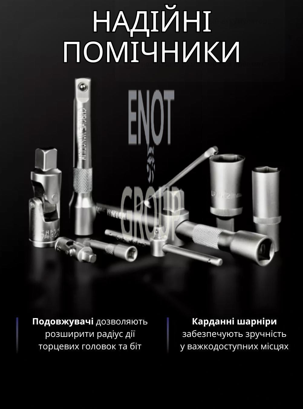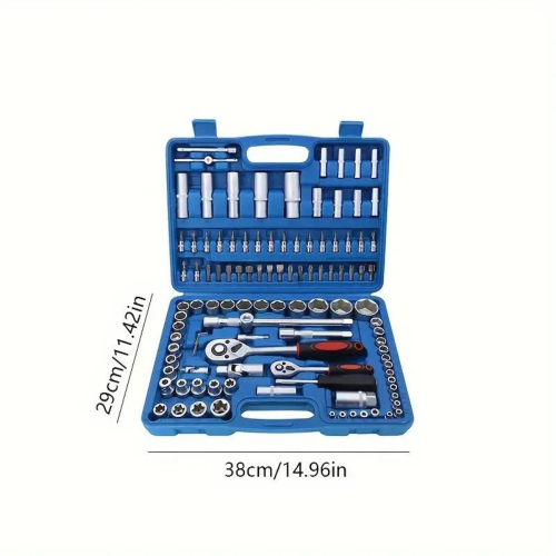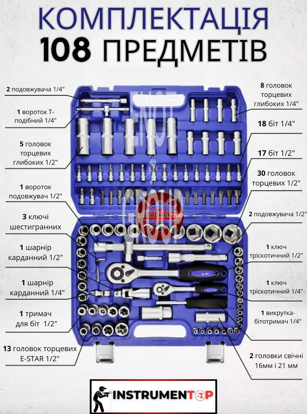 - 108 предметів: Широкий асортимент інструментів, що включає головки різних розмірів, тріскачки, подовжувачі та інші насадки для вирішення різних ремонтних завдань.
