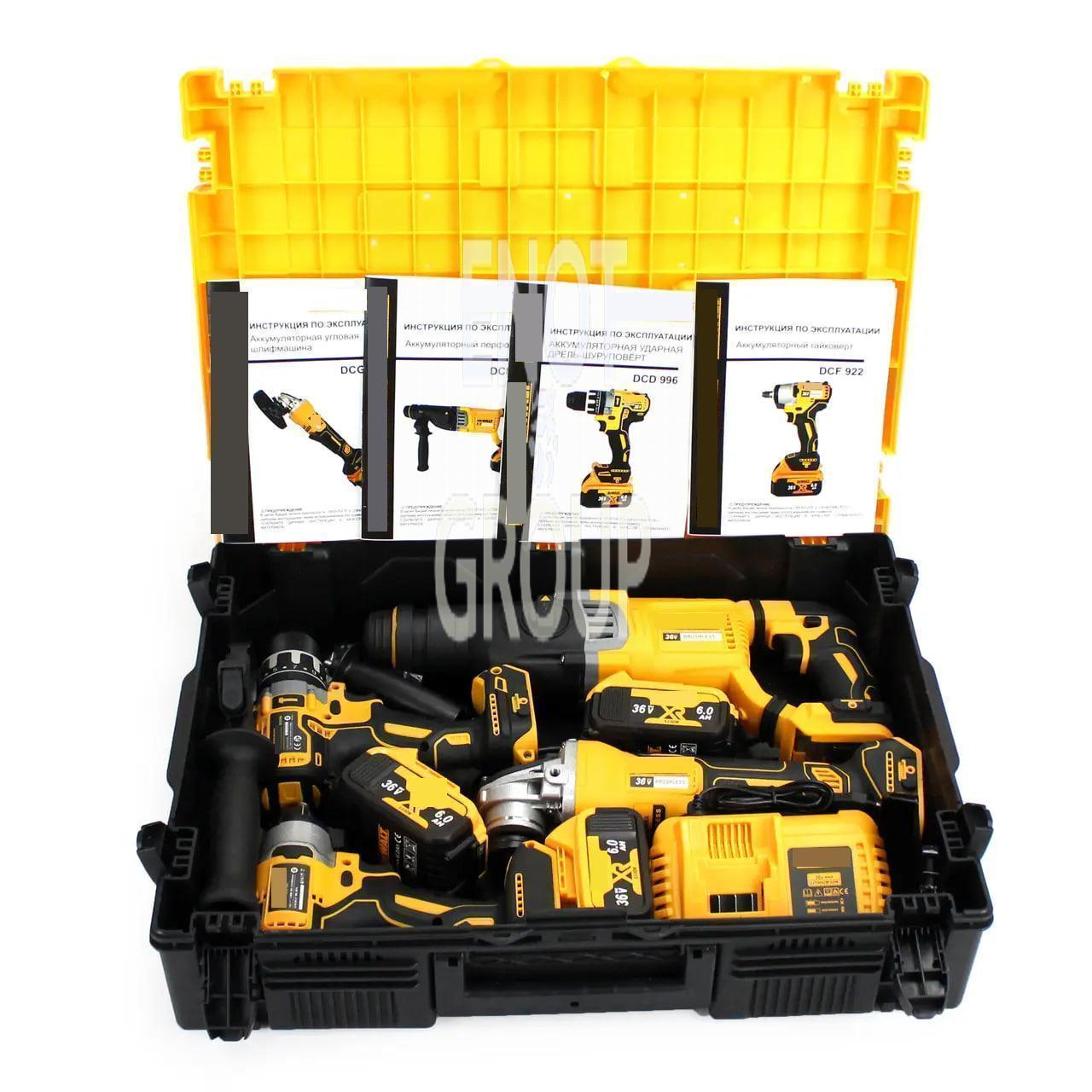 Цей професійний набір 4-в-1 Instrumentop 36V поєднує в собі ефективність, довговічність та зручність використання. У комплект входять чотири потужні інструменти: ударний шуруповерт DCD996, кутова шліфмашина DCG413, перфоратор DCH263 та гайковерт DCF922. Ідеальне рішення для професіоналів і домашніх майстрів, які цінують високу продуктивність та якість.