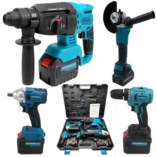 Набір акумуляторного електроінструмента 4-в-1 Wunderkraft — ідеальне рішення для домашнього та професійного використання. Комплект включає перфоратор, шуруповерт, гайковерт та болгарку, що дозволяє виконувати широкий спектр завдань: свердління дерева, металу та бетону, монтаж конструкцій, закручування та розкручування кріплень, шліфування та різання матеріалів.