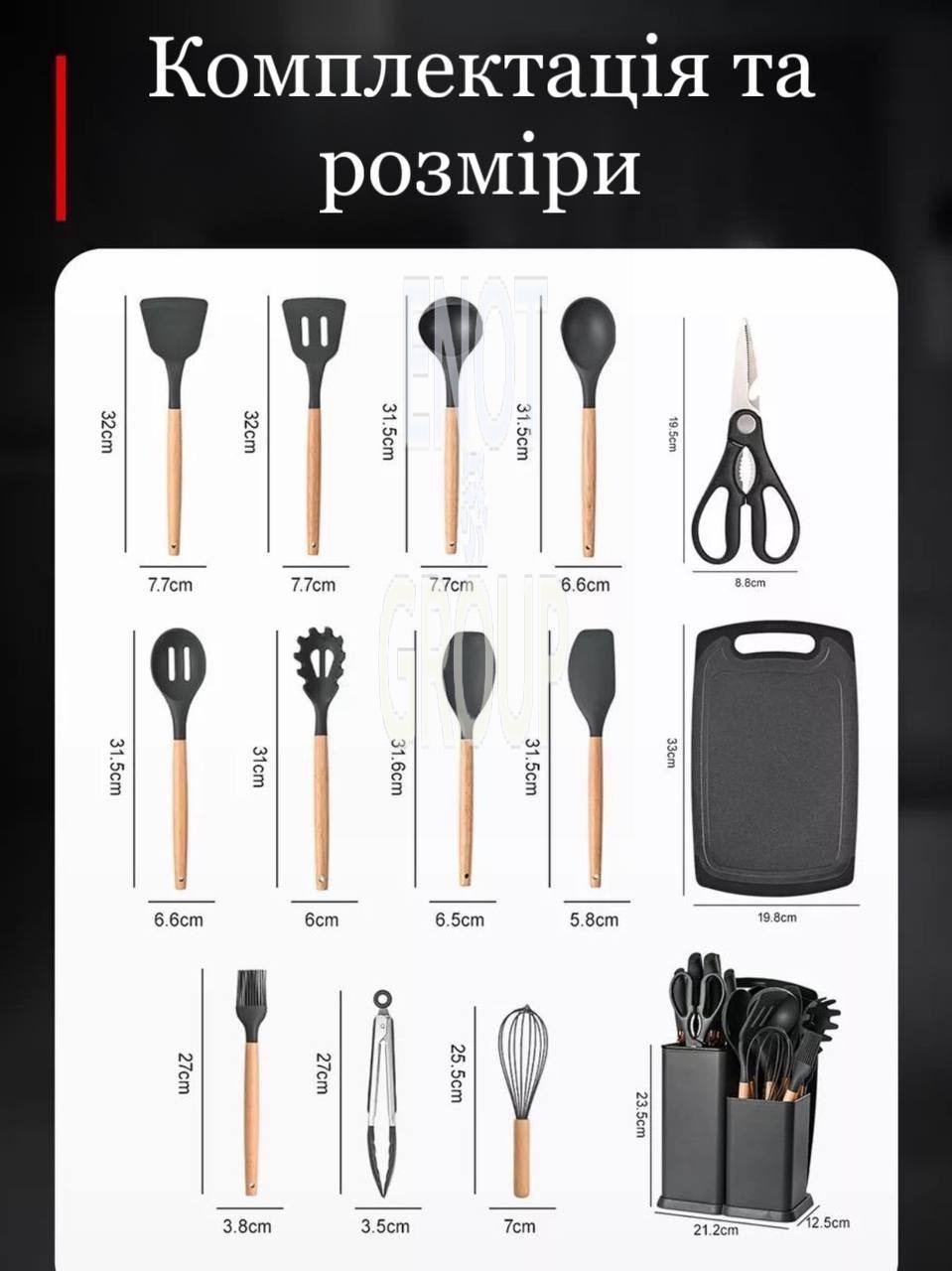 - Комплектація з 19 предметів: включає лопатки, вінчики, ложки та інші важливі інструменти, що робить набір універсальним для будь-яких страв;