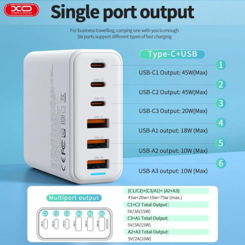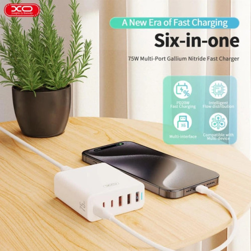 Настільний зарядний пристрій XO L133 75W GaN 3 USB 3 Type-C для швидкої та безпечної зарядки