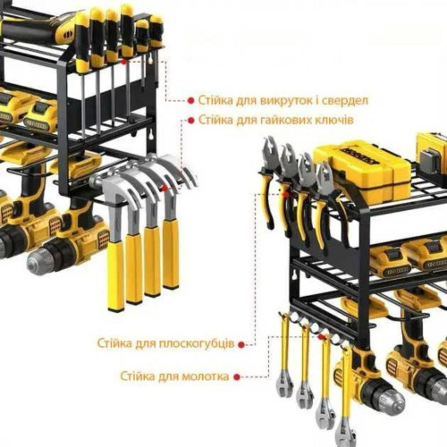 Конструкція: 3 рівні + бокові тримачі для молотка, плоскогубців, викруток, гайкових ключів
