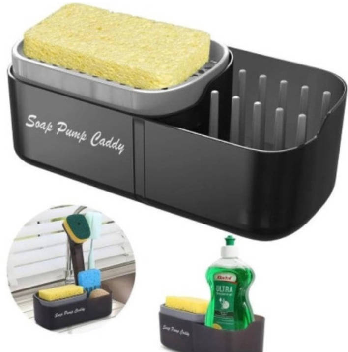 Органайзер Soap Pump Caddy — ідеальне рішення для вашої кухні, оснащене дозатором для мийного засобу. Він виготовлений з міцного чорного АБС-пластика, який забезпечує надійність і стійкість до механічних навантажень. Додатково, органайзер має відділення для дрібних кухонних аксесуарів та спеціальну комірку для губки, яка також служить дозатором для чистячого засобу.