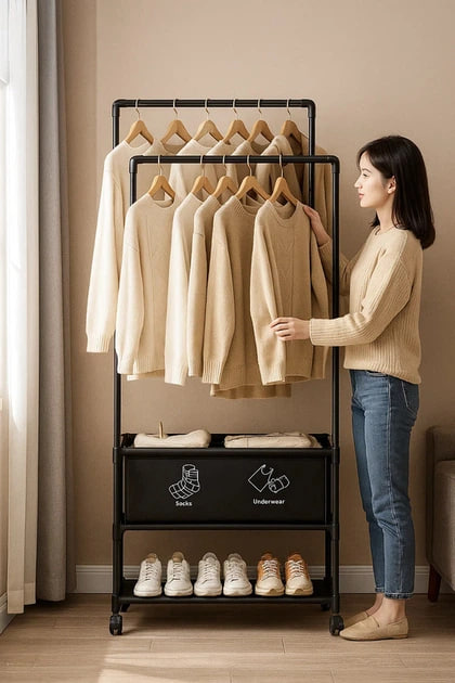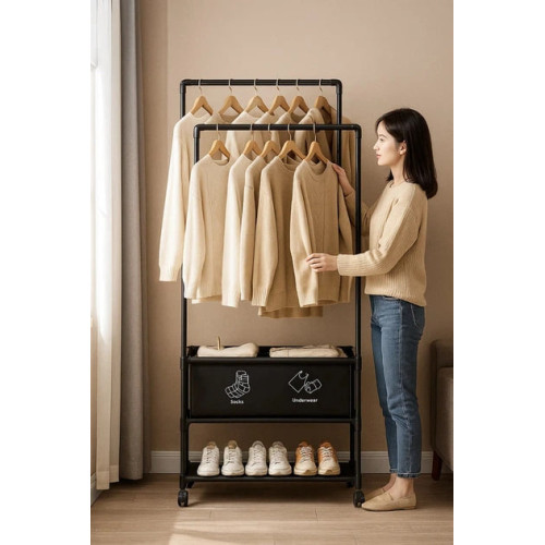 Підлоговий рейл-органайзер YH9918-3A Мобільна вішалка-стелаж із ящиком для білизни та полицею для взуття