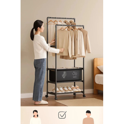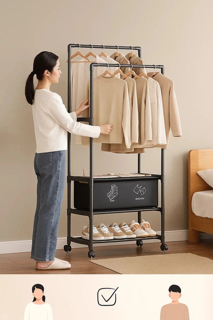 Ваш одяг заслуговує на гарне зберігання! Стійка YH9918-3A — це ідеальний компроміс між стилем та порядком. Більше ніяких «гори одягу» на стільцях. Цей компактний девайс перетворює хаотичне розкидання речей на організовану виставку вашого улюбленого гардероба.