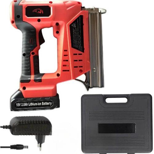 Корпус виготовлений із міцного ударостійкого пластику та металу, а продумана ергономіка знижує втому під час роботи. Інструмент оснащений містким магазином на 100 цвяхів та системою швидкої заміни кріплення. У комплекті — міцна пластикова валіза для транспортування.