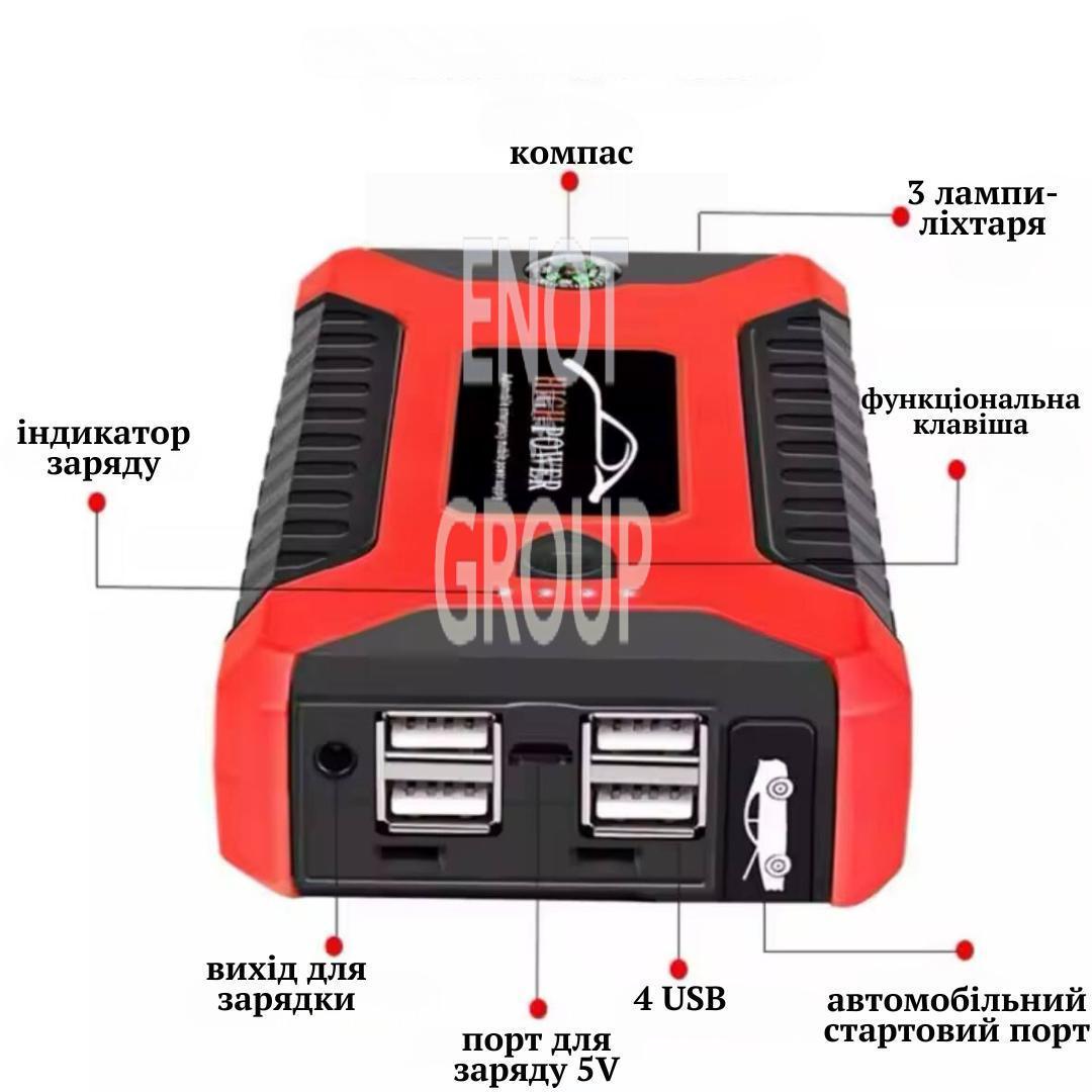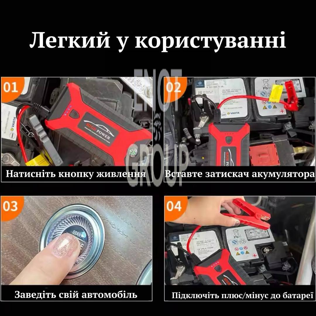 - Багатофункціональність – використовуйте як пусковий пристрій, Power Bank для зарядки гаджетів та LED-ліхтар із режимами SOS для екстрених ситуацій.