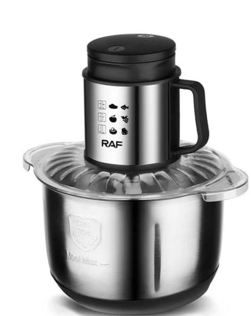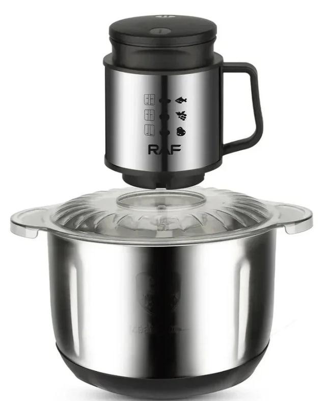 Якщо ви шукаєте потужний і багатофункціональний пристрій, зверніть увагу на RAF R7025 (5 л, 1000 Вт). Цей кухонний комбайн поєднує функції подрібнювача, міні-блендера та м’ясорубки.