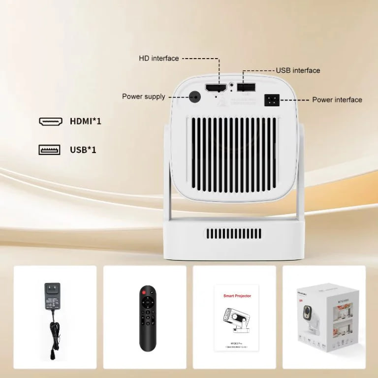 Проектор має повний набір інтерфейсів: HDMI, USB, AV, AUX 3.5 мм, що робить його сумісним із ноутбуками, приставками, флешками та ігровими консолями. Компактний та стильний корпус робить HY260PRO ідеальним для дому, офісу, навчання, подорожей та кемпінгу.