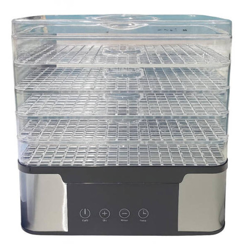 Сушарка оснащена 5 місткими ярусами, які легко знімаються та миються. Ви можете регулювати температуру залежно від типу продуктів — від ніжних ягід до щільних шматочків м’яса. Прозора кришка дозволяє стежити за процесом, не відкриваючи корпусу.