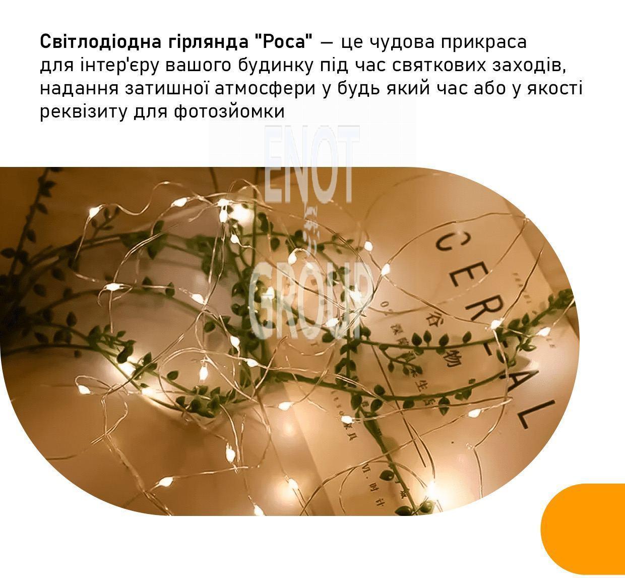 Світлодіодна гірлянда-нитка «Краплі роси» — це елегантна та універсальна прикраса, яка додає особливого шарму будь-якому інтер’єру. Витончені мініатюрні світлодіоди, схожі на краплі роси, створюють м'яке, приємне світло. Завдяки живленню від батарейок, гірлянду можна розмістити де завгодно без потреби в електромережі.
