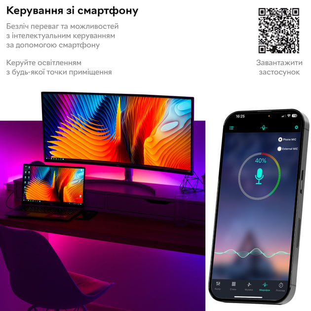 За допомогою пульта дистанційного керування можна легко змінювати колір підсвічування, перемикати ефекти та створювати потрібний настрій у будь-який момент.