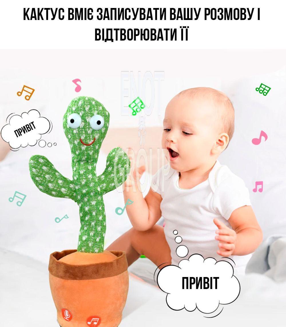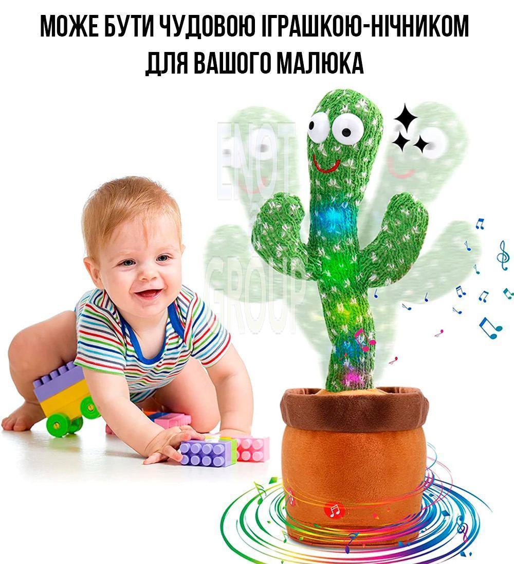 - Функція повтору: Кактус повторює звуки та фрази, що стимулює мовленнєвий розвиток дитини.
