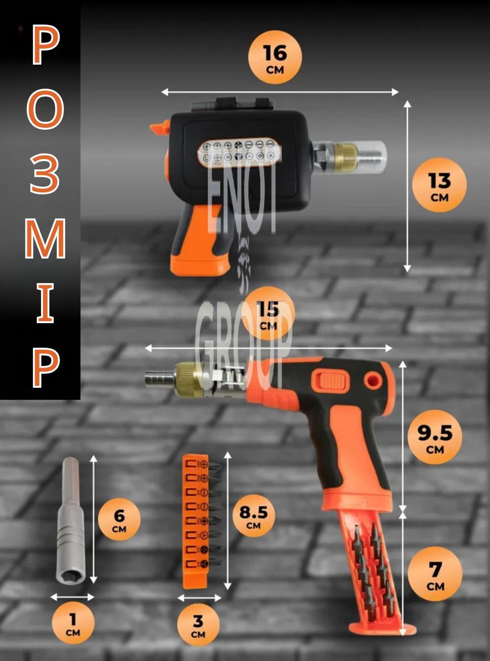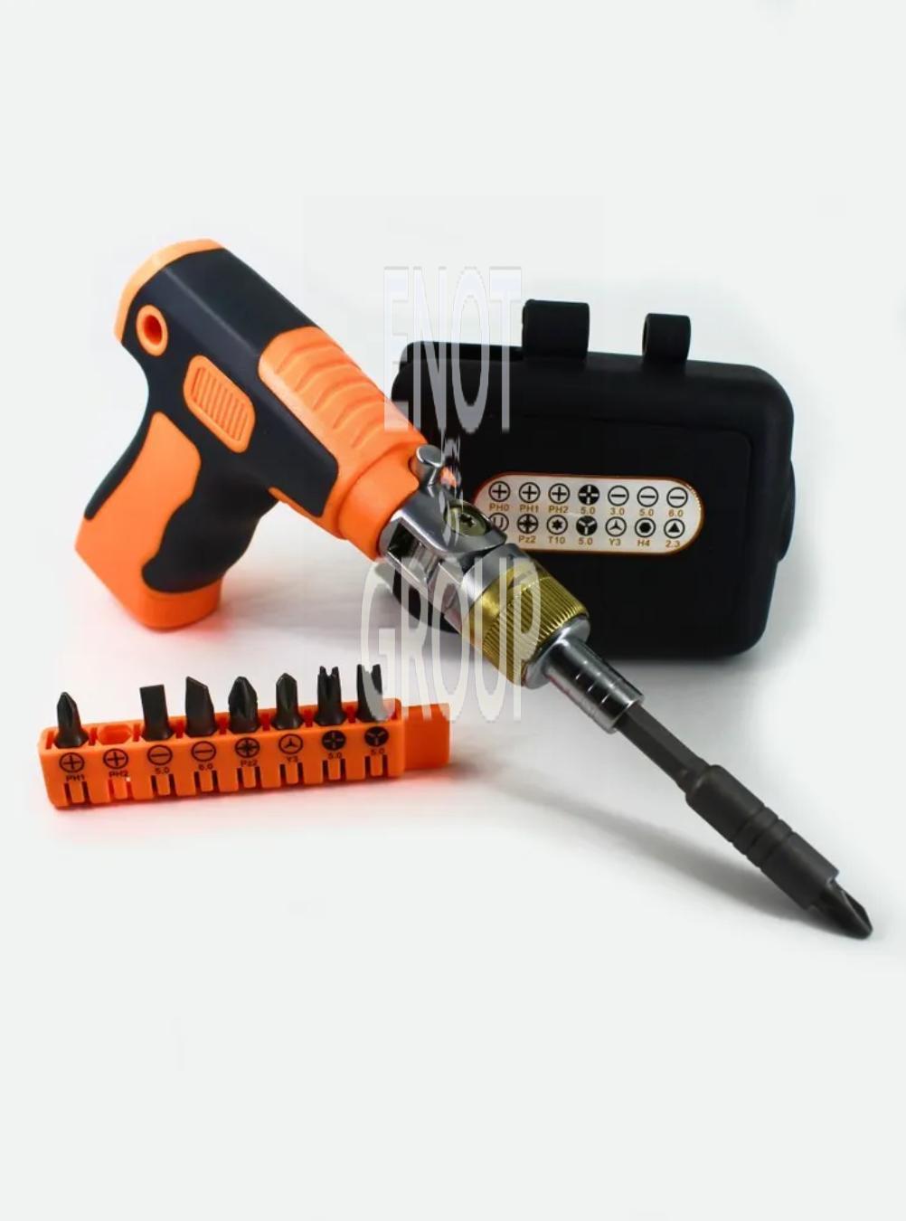 Ця багатофункціональна викрутка має унікальний пістолетний дизайн з можливістю обертання головки на 180°, що дозволяє працювати навіть у важкодоступних місцях. У комплект входить 14 змінних магнітних біт, подовжувач і практичний чохол із зажимом.