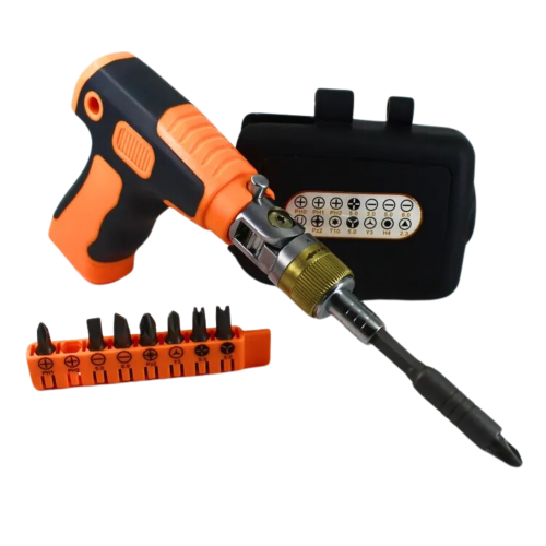 Ця багатофункціональна викрутка має унікальний пістолетний дизайн з можливістю обертання головки на 180°, що дозволяє працювати навіть у важкодоступних місцях. У комплект входить 14 змінних магнітних біт, подовжувач і практичний чохол із зажимом.