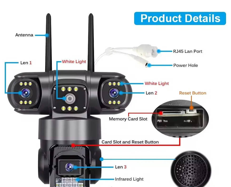 Вулична камера YFY003 V380 WIFI створена для постійного контролю території у режимі 24 на 7. Три камери та поворотна конструкція забезпечують широкий кут огляду. Пристрій легко інтегрується у систему безпеки через WiFi.